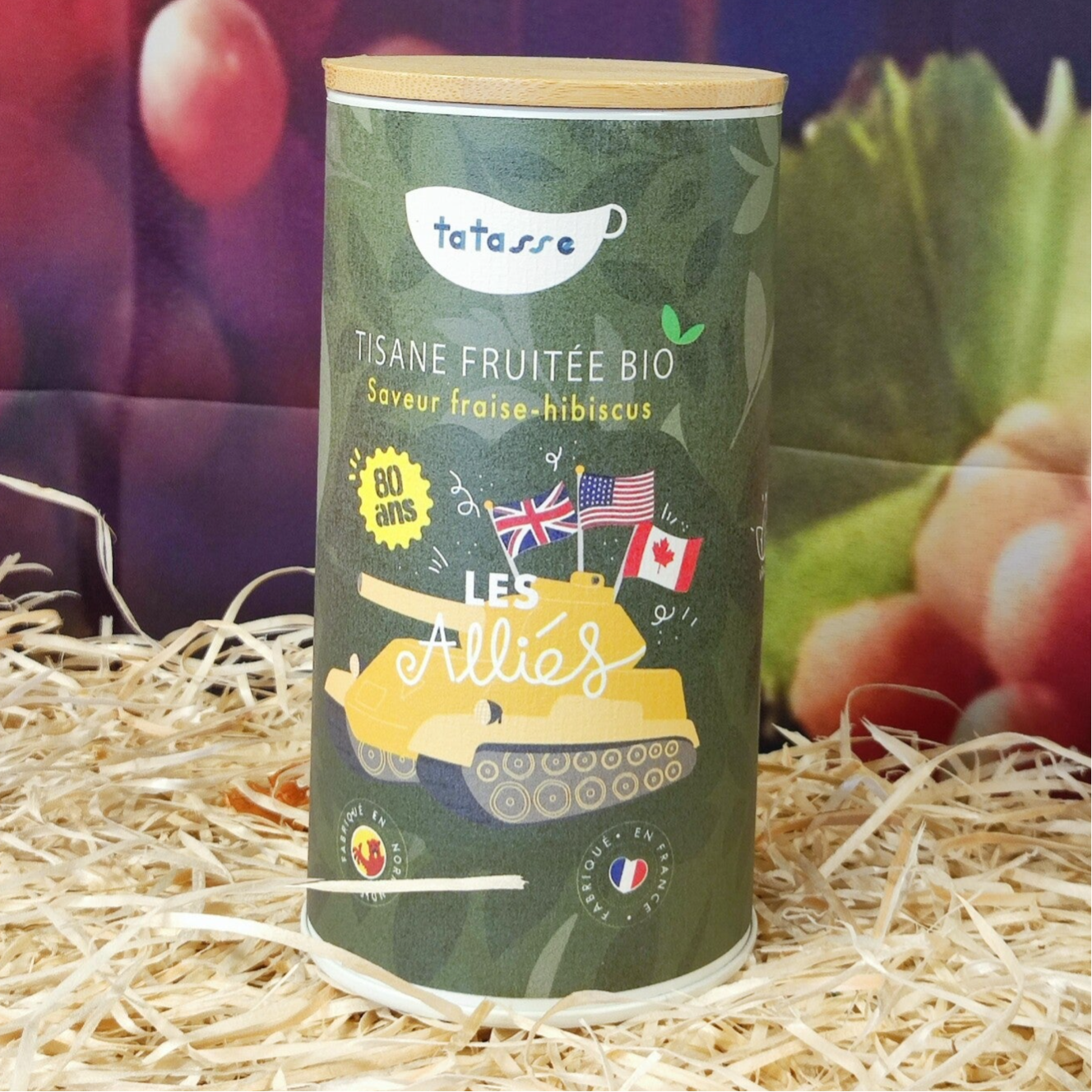 Dégustez la tisane fruitée bio Fraise Hibiscus Les Alliés de Tatasse, un mélange exquis de fraises, de pommes et de fleurs d’hibiscus, parfait pour se détendre. Inspiré par le Débarquement en Normandie de 1944, ce thé rend hommage aux actes héroïques des alliés avec son nom et son design symbolique, marquant ainsi les 80 ans de cet événement historique.